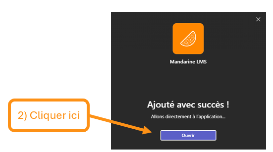 - Une fois l’ajout validé, le message suivant s’affiche. Cliquer sur « Ouvrir » pour afficher l’application